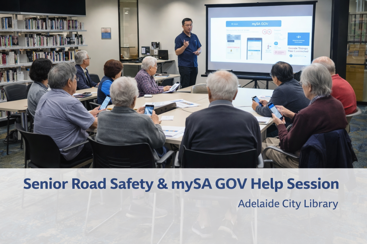 Adelaide Senior Road & Health Association 将在 Adelaide City Library 举办小型社区讲座(最多10人),介绍基本道路安全知识,并协助长者注册和使用 mySA GOV,同时介绍澳大利亚 Be Connected 数字技能学习计划。